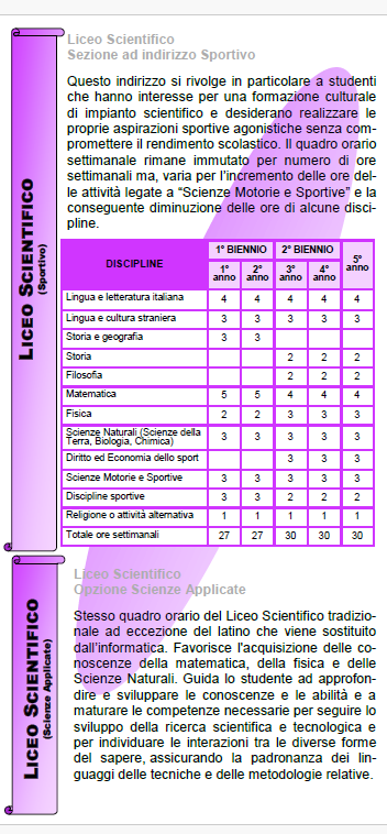 Il liceo scientifico - sezione a indirizzo sportivo dà modo di approfondire le scienze motorie e le discipline sportive, all’interno di un percorso che offre sia una buona preparazione di base nelle discipline umanistiche sia conoscenze e metodi propri delle scienze matematiche, fisiche e naturali nonché dell’economia e del diritto.